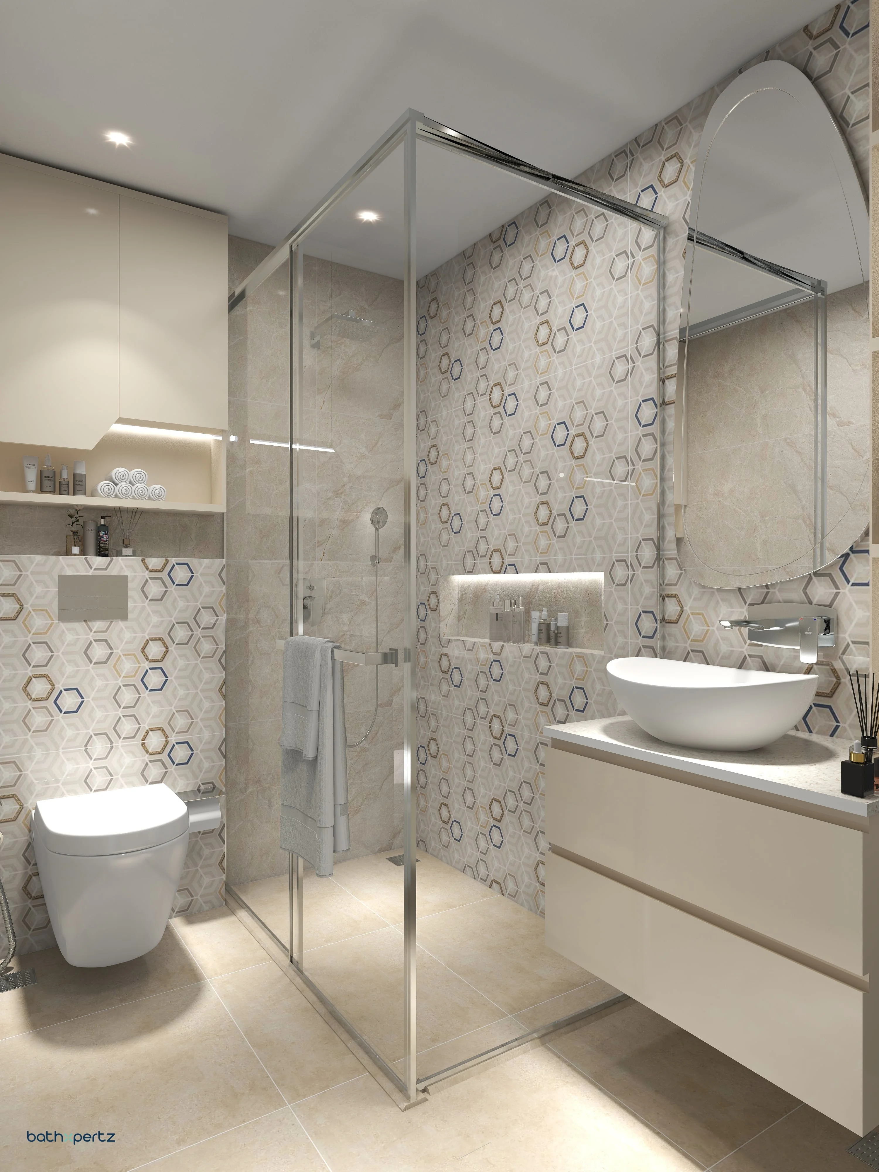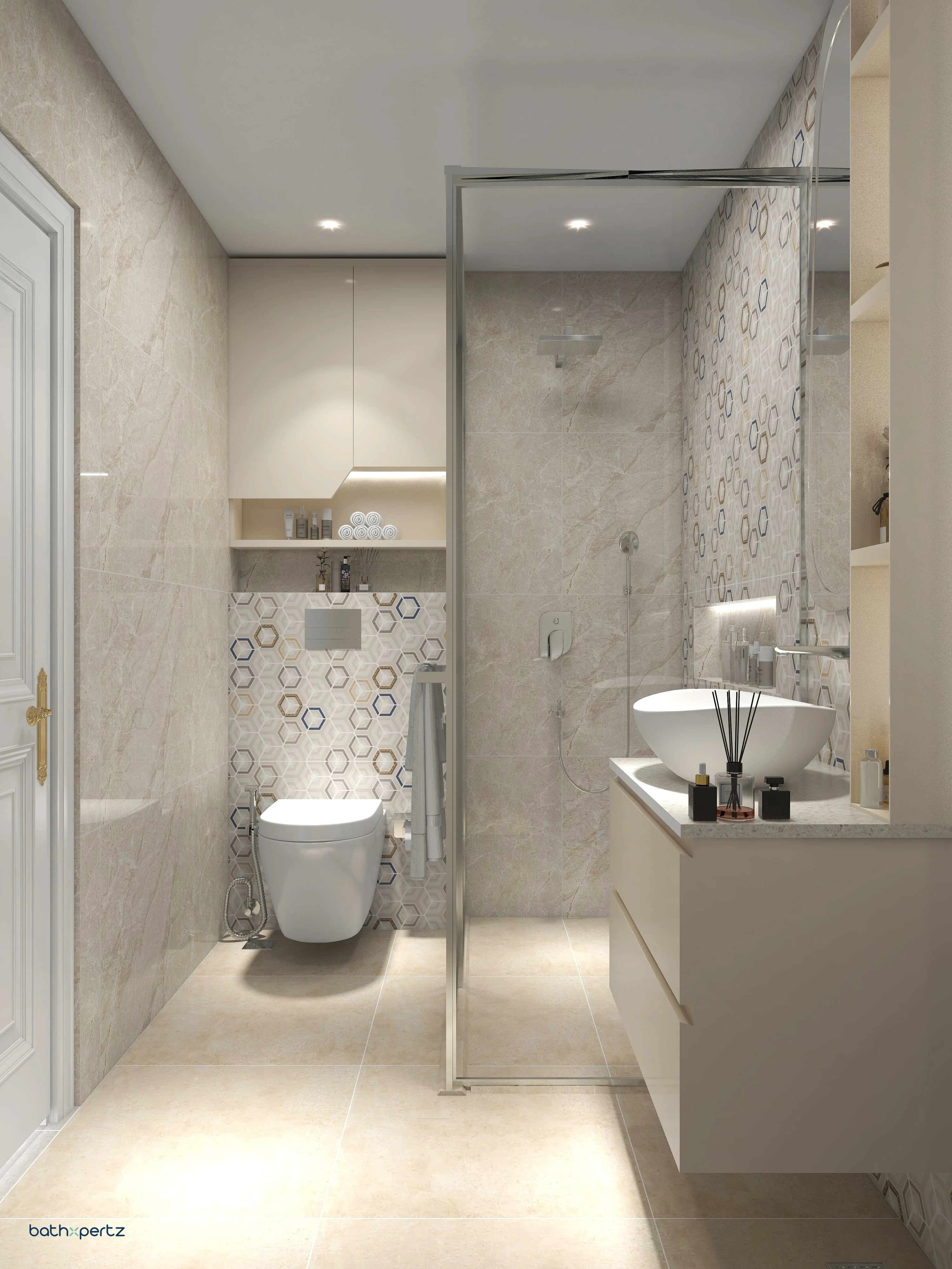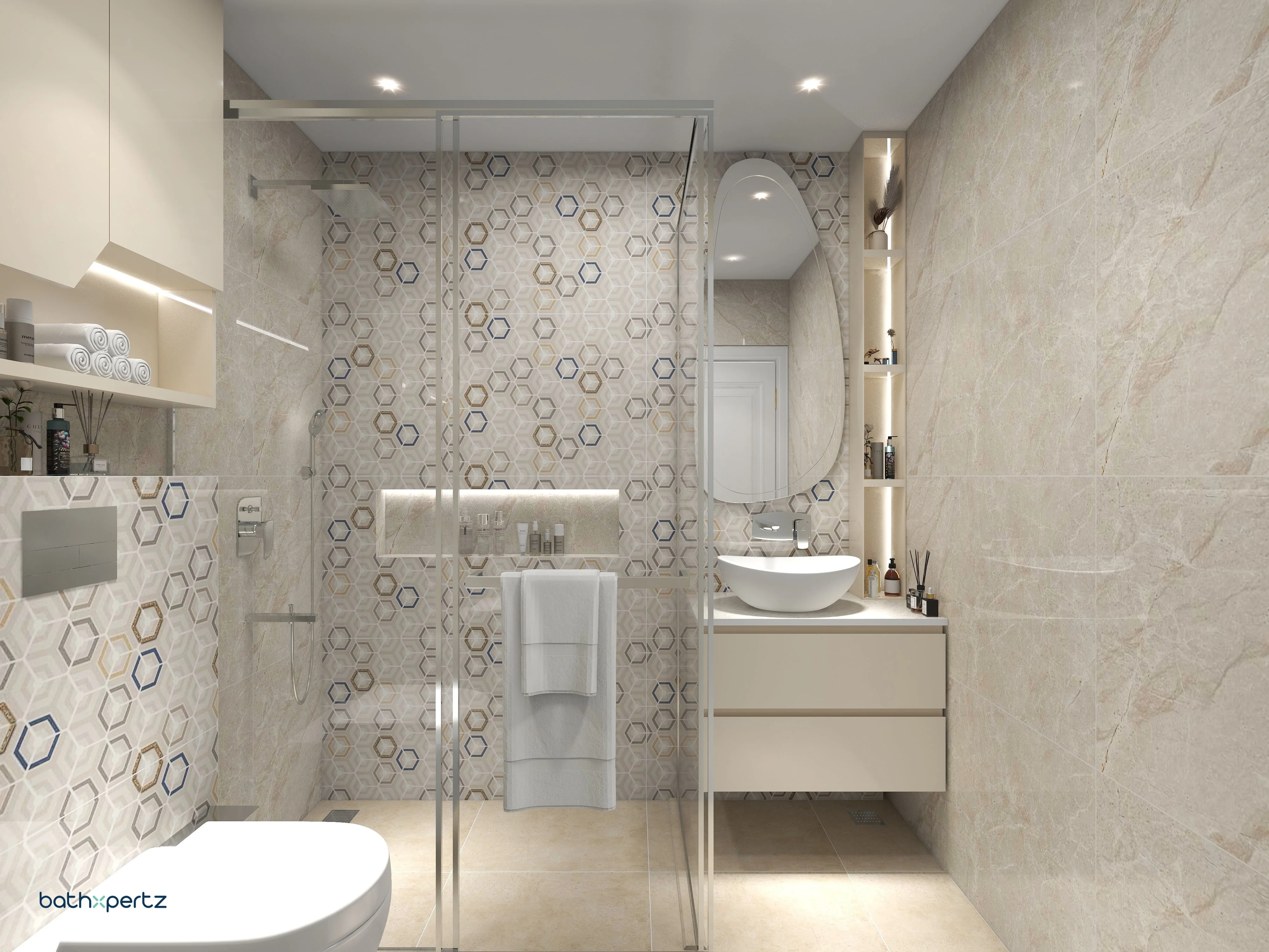 Tranquil Oasis epitomizes Moroccan charm with highlighted tiles in serene hues of grey, accentuating the space against sleek grey flooring. A designer mirror complements the modern vanity, while a chic shower cubicle enhances functionality. Infused with modern elements, it's a space-saving sanctuary radiating elegance and tranquility in Moroccan-inspired design.